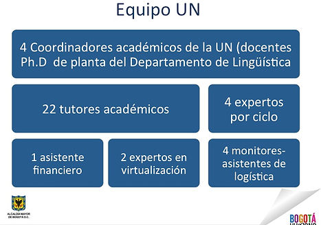 Acompañaremos a los docentes de las 84 instituciones distritales, vinculadas a ILEO, 4 doctoras en educación y lenguaje, docentes de planta del departamento de lingüística de la Universidad Nacional de Colombia.